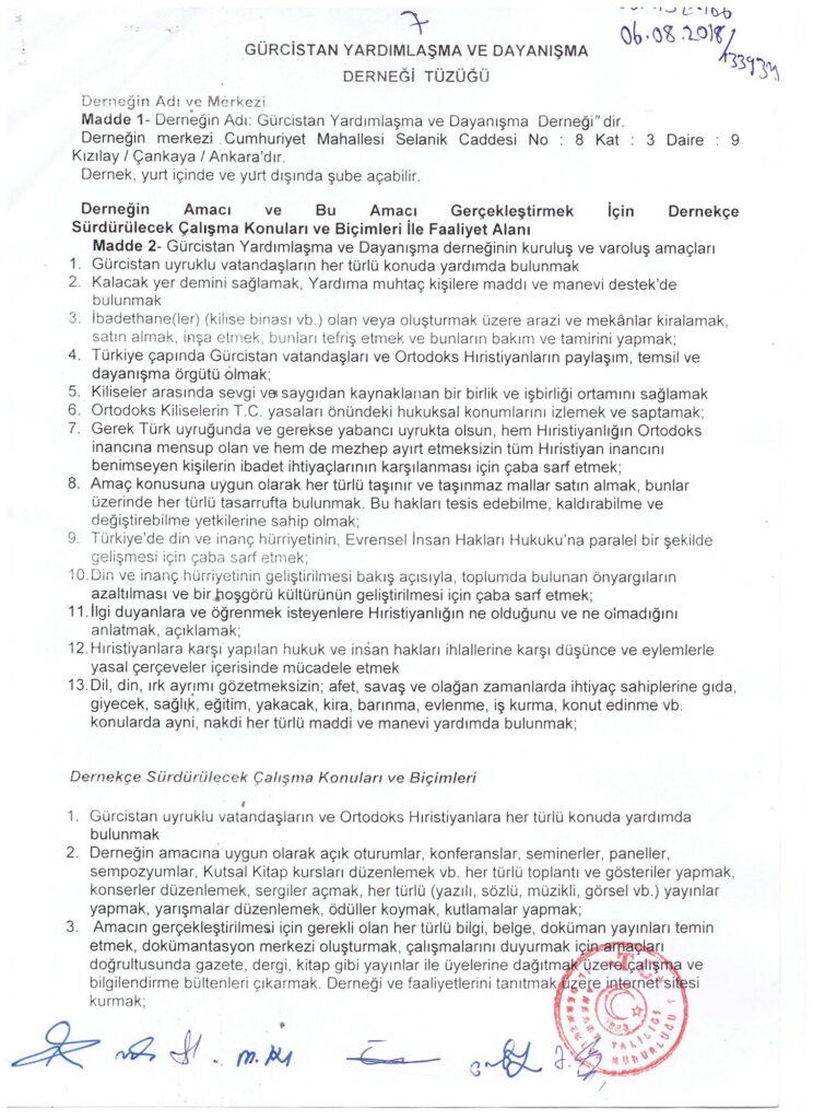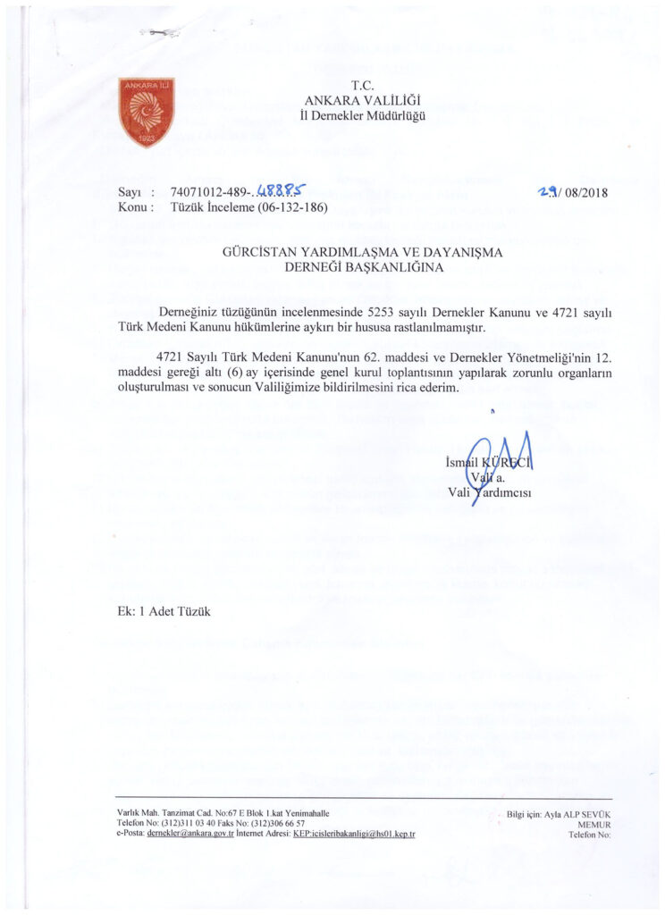 Derneğin Adı ve Merkezi Madde 1-Derneğin Adı: Gürcistan Yardımlaşma ve Dayanışma Derneği” dir. Derneğin merkezi : Cumhuriyet Mahallesi Selanik Caddesi No : 8 Kat : 3 Daire 9 Kızılay/ Çankaya / Ankara’dır. Dernek, yurt içinde ve yurt dışında şube açabilir.